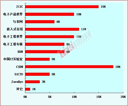 調(diào)查數(shù)據(jù)顯示,在嵌入式工程師經(jīng)常關(guān)顧的網(wǎng)站中,CSDN??21IC所占的比例大,分別??18%??15%,而這兩個(gè)網(wǎng)站也分??代表了軟件開發(fā)人員以及電子工程師兩類人群,其他網(wǎng)站(如嵌入式在線、電子工程世界、電子工程專輯、電子產(chǎn)品世界、EDN所占比例均??8%-11%左右,較為平均,而其他剩余網(wǎng)站所占比例則相???較小??