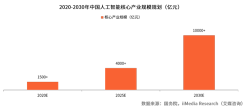 根據(jù)《新一代人工智能發(fā)展規(guī)劃》,2020年中國人工智能的技術(shù)與應(yīng)用水平將發(fā)展至世界先進(jìn)水平,同時核心產(chǎn)業(yè)規(guī)模超過1500億。2030年中國人工智能核心產(chǎn)業(yè)規(guī)模超過1萬億元。